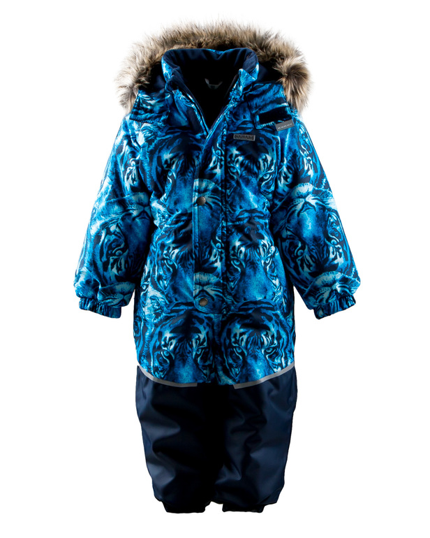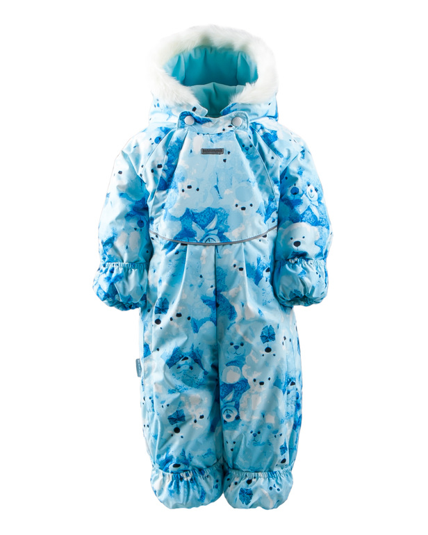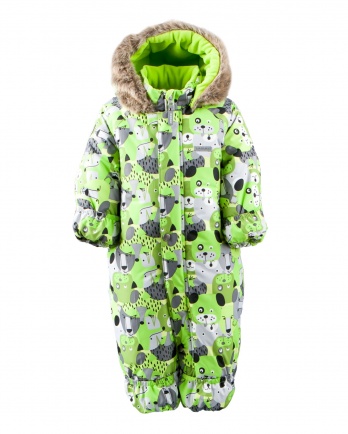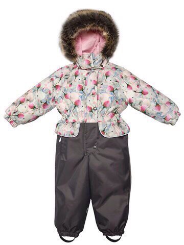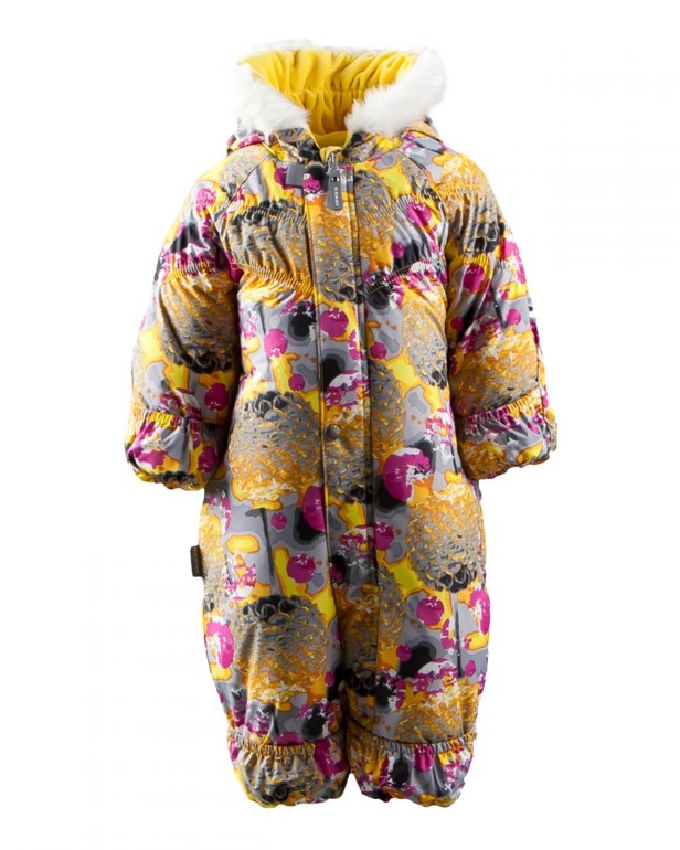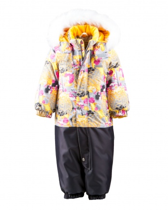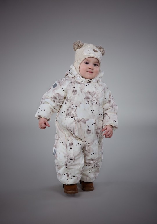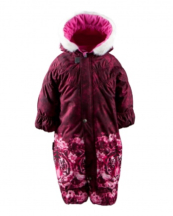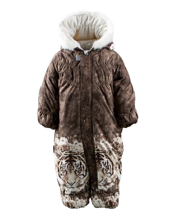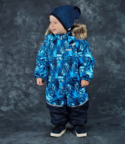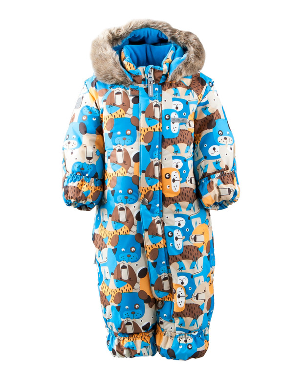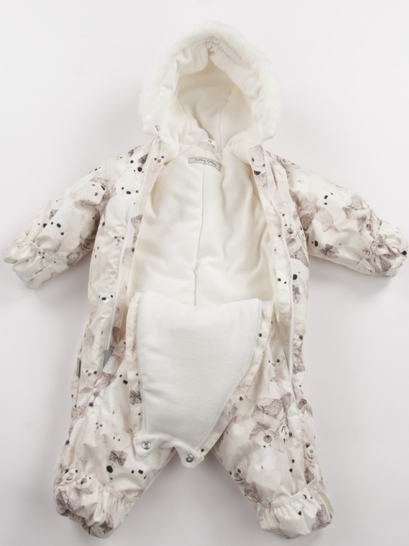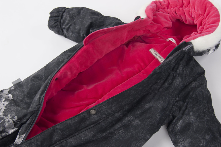 выполнен из ткани с принтом. Утеплитель KERRYFILL 330 гр. Подкладка и отделка 80% хлопок и 20% полиэстер (велюр).Сзади на талии и по кокетке резиночка. На рукавах и ножках отвороты. Неотстегивающийся капюшон. Одна молния с закрывающимся клапаном на кнопках.
