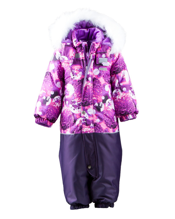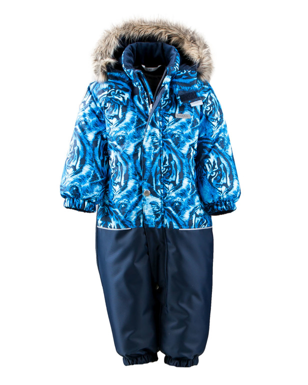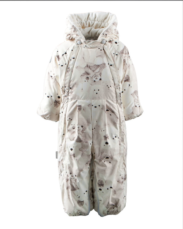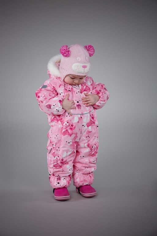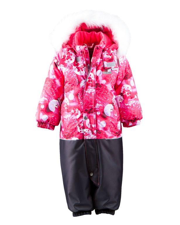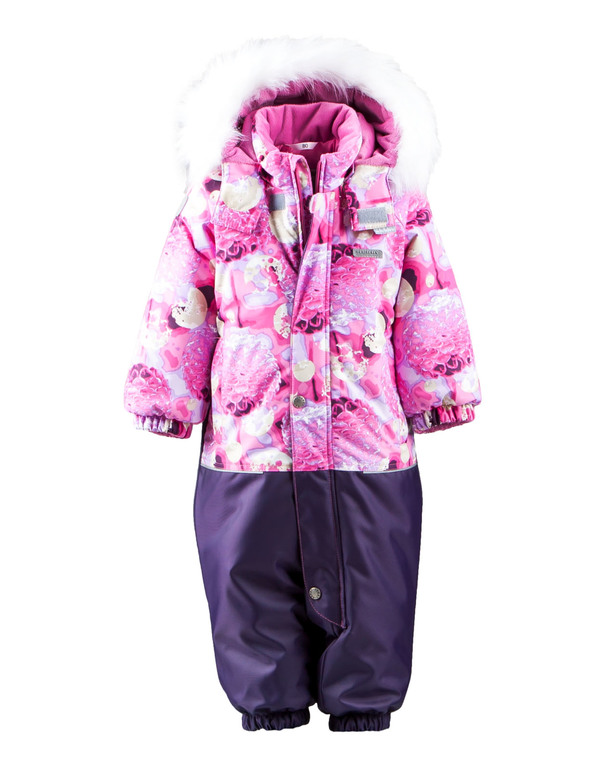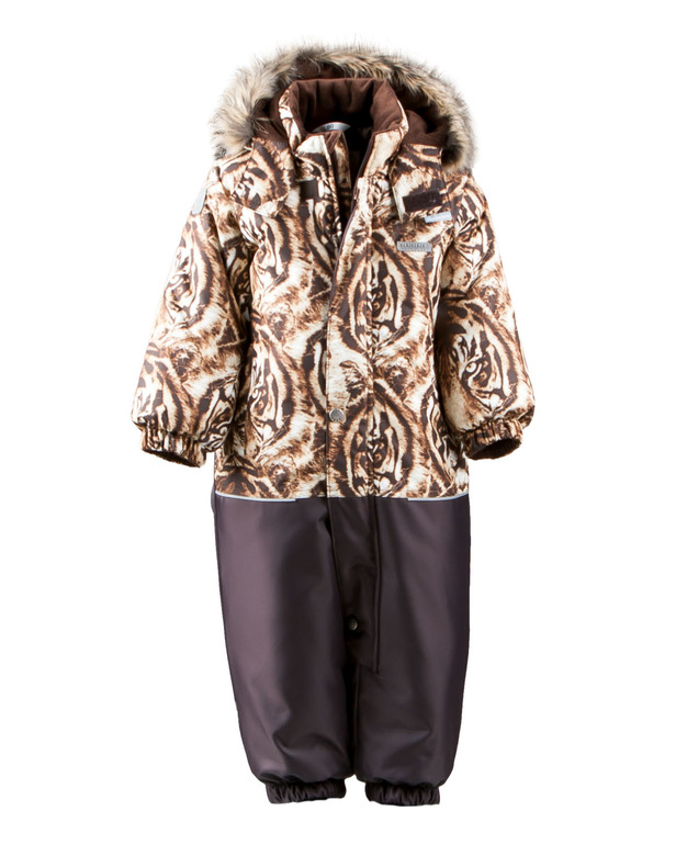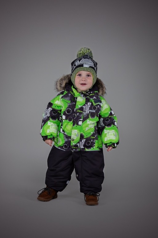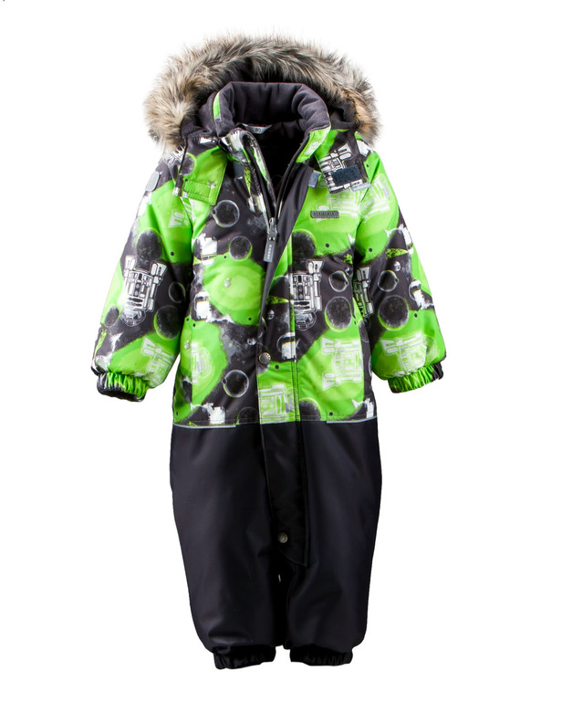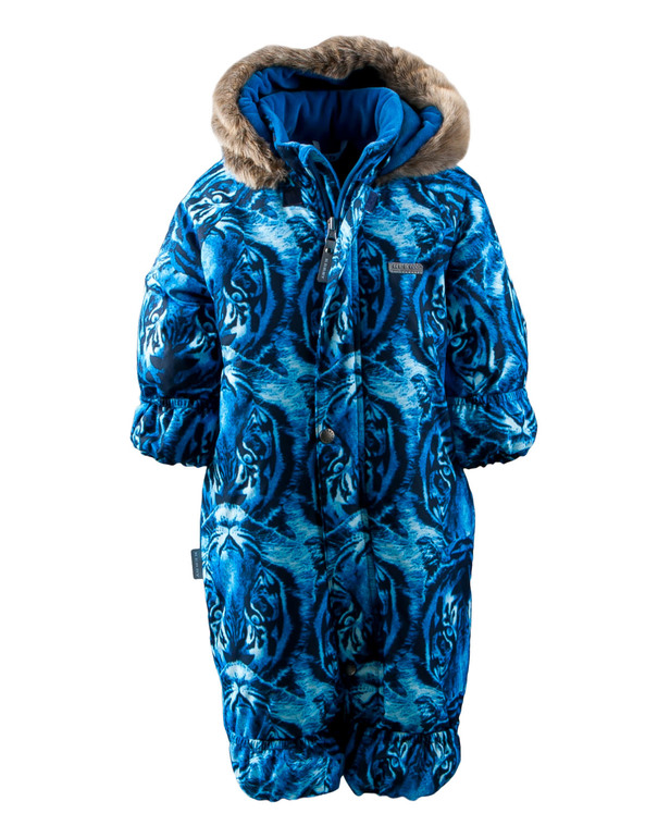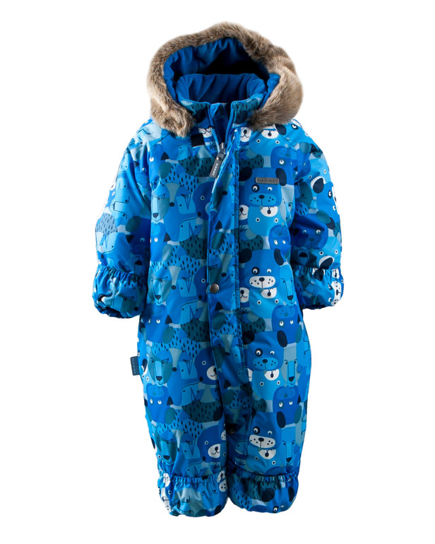 выполнен из ткани с принтом. Утеплитель KERRYFILL 330 гр. Подкладка и отделка 80% хлопок и 20% полиэстер (велюр).Сзади на талии и по кокетке резиночка. На рукавах и ножках отвороты. Неотстегивающийся капюшон. Одна молния с закрывающимся клапаном на кнопках.