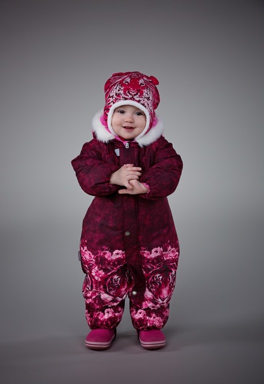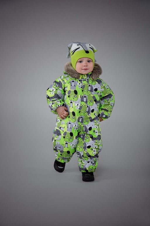 выполнен из гладкой однотонной ткани и из ткани с принтом. Утеплитель KERRYFILL 330 гр. Подкладка и отделка 80% хлопок и 20% полиэстер (велюр). Сзади на талии резиночка.На рукавах и ножках отвороты. Неотстегивающийся капюшон с меховой опушкой (искусственный мех). Капюшон в форме гномика и на конце помпон. Одна молния с закрывающимся клапаном на кнопках.
