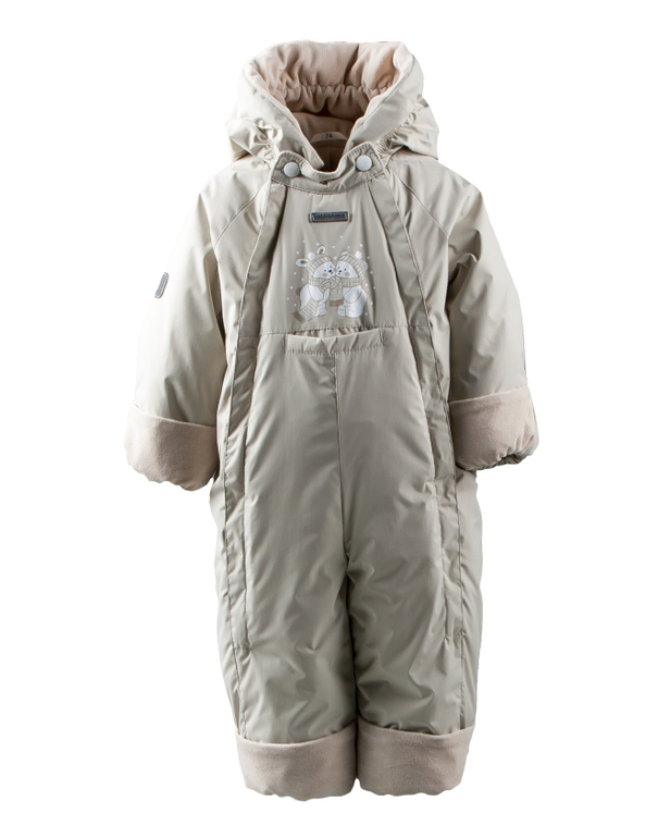 выполнен из гладкой однотонной ткани и из ткани с принтом с изображением зайчиков. Утеплитель KERRYFILL 330 гр. Подкладка и отделка 80% хлопок и 20% полиэстер (велюр).Сзади на талии резиночка.На рукавах и ножках отвороты. Неотстегивающийся капюшон с меховой опушкой (искусственный мех).Капюшон в форме гномика и на конце помпон. Одна молния с закрывающимся клапаном на груди.