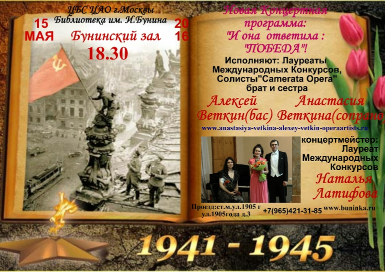 Новости сообществаПредлагаю бесплатную возможность посетить прекрасный концерт военной песни "И она ответила :"Победа!"-можно всей семьей!Премьера концерта с огромным успехом прошла 7 мая в Центральном музее вооруженных сил РФ.Место проведения - прекрасный и гостеприиимный Бунинский зал в шаговой доступности от ст.м. 1905 года .15 мая(воскресенье) в 18.30 .Концерт часовой.Естественная акустика,только живой звук от ведущих солистов Камерата Опера и Лауреатов Международных Фестивалей и Конкурсов - впечатления незабываемые!Программа необычная -состоит из всеми любимых и малоизвестных песен и дуэтов! Отзывы!