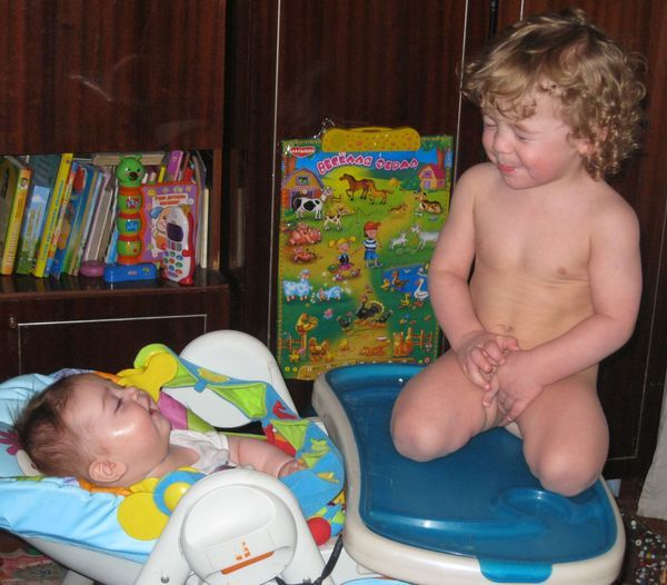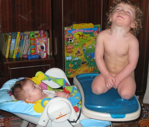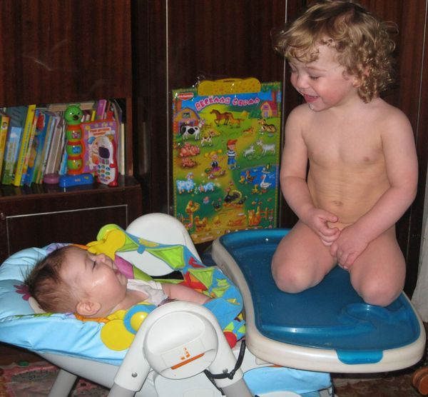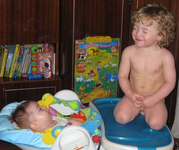 Игры погодковСтаршенький вчера после ванной устроил показательное выступление для брата. Вылез к нему на стульчик и давай номера исполнять: и брррукал, так что слюни летели, и рожи корчил, и какие-то акробатические этюды выделывал. Оба при этом так заразительно хохотали, что мы с мужем еле сдерживались, чтоб не отвлекать их.