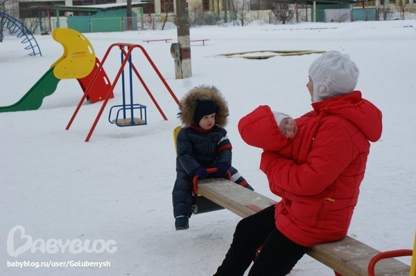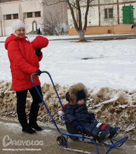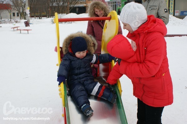 Когда дочка доросла до слингорюкзака (3,5 месяца) – её туда под слингокуртку, сын за ручку, в руках санки (либо сын на коляске). Дочка в слинге засыпала быстро, спала несмотря на мои активные движения со старшим на горках-качелях.