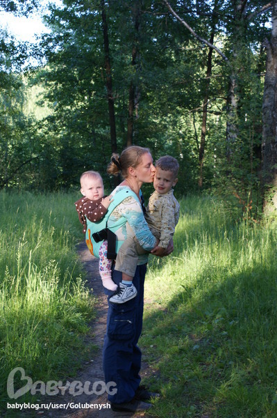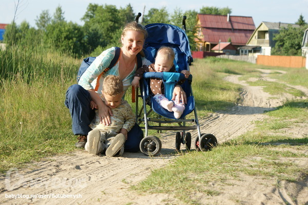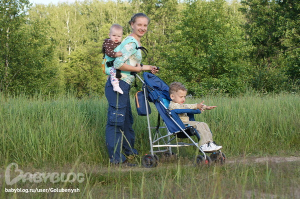Сейчас младшей 9 месяцев, старшему 2,2. Дочка в трости, сын рядом идёт. Иногда, правда, ходим на двойной коляске – когда надо куда-то далеко и быстро, или в магазин. Или дочка в рюкзаке, сын в трости. Словом, возможны варианты. Ниже иллюстирую (фотографии все с дачного отдыха):