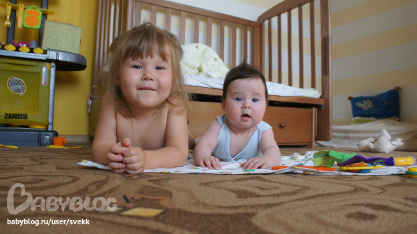 Вообще игра на полу - прекрасное занятие! Соня играет, Полина наблюдает, грызя погремуху. Так их можно оставить на время вдвоем.