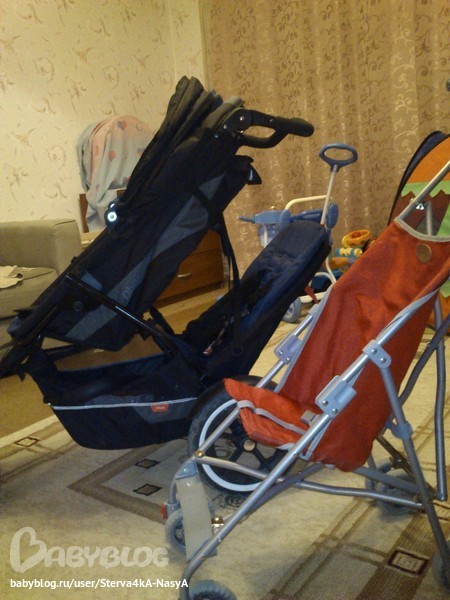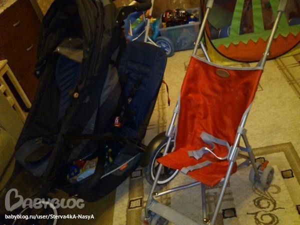 там за шторкой маленький. чаще даже верхнее сиденье не ставлю, а складываю в корзину и когда старший устает достаю. бордюры без проблем, только сначало не привычно было на трех колесной, сейчас все ок. ну а пыль, впринципе коляска не самая низкая, те многие трости такой высоты