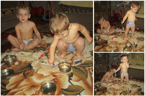 хахаха, видео вообще улет!)))) А главное дети вместе играют, но меня пугает последующая уборка после таких игр. Один раз мы так поиграли, больше МНЕ не хочется))))) Молодец, что не побоялась детям крупу дать)