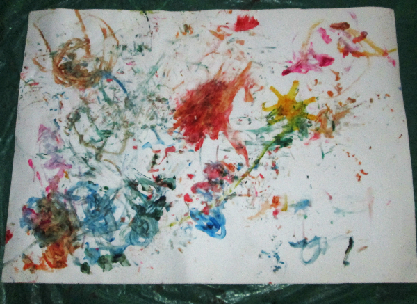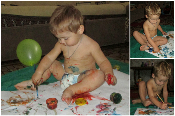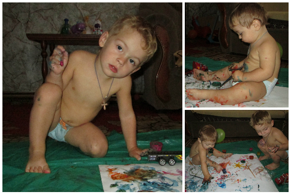 Денис тоже пальцами не особо любит рисовать, это когда совсем в раж войдет. А в годовалом возрасте вообще брезгливый был, не любил, когда руки грязные. А Пашка балдеет, его измазанные руки, пузо и рот ни капли не смущают)))
