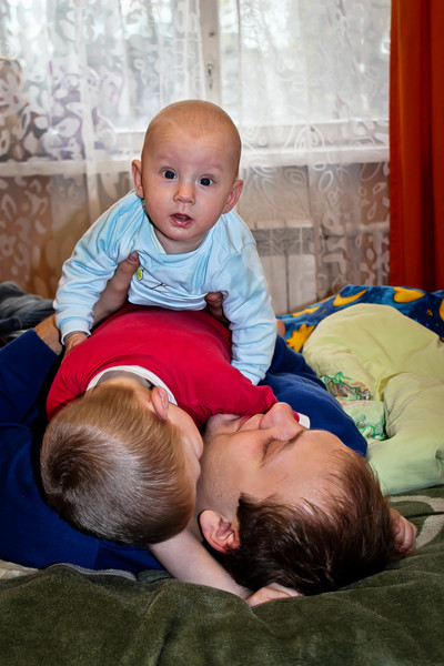 А еще, папа научил своего старшего отпрыска щекотать головой карапуза. Ну знаете как это бывает - головой трогаешь животик малыша и крутишь ею. Нежности в Диминых глазах нет предела, а малыш заходится хохотом.