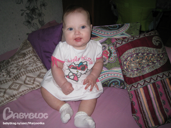 Ползает) Если из комнаты ухожу, приползает ко мне на кухню. Сама пытается сидеть, но пока не особо получается. Посидит-посидит и падает)
