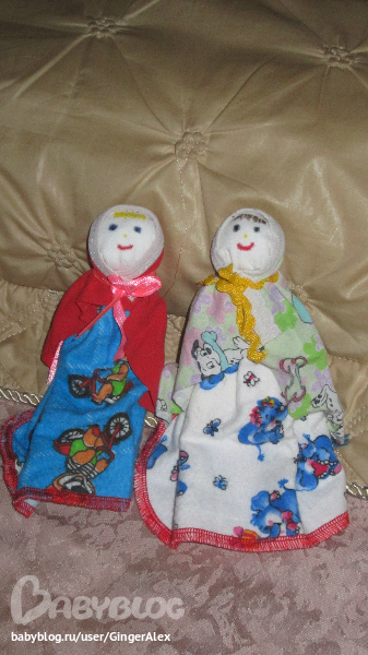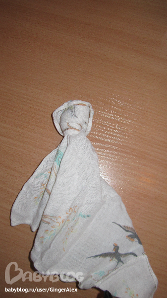 кошда уже сделали, то я вспомнила, что нам моя мама всегда делала куколок из носовых плоточков, и эта кукла вытирала нам слезки... делается посто, надо с одного угла платочка завязать узелок и кукла готова...