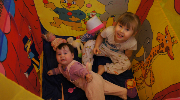 Любимая игра - в домике сидеть. Причем Соня всегда просит Полинку к ней посадить через крышу, чтобы та "прилетела"