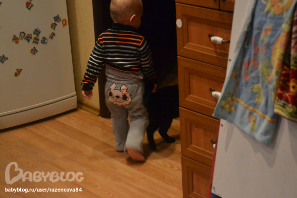 Пока Мурзк доедает и смотрит мультик...Степа дорвался до кошки!!! Дана, спасибо тебе, что ты у нас есть....в это время я мою посуду, запускаю стирку....Потом Степу беру и иду укладывать...Засыпаем так....беру его на руки, он кладет голову мне на плечо, попутно я собираю игрушки в детской и он засыпает.