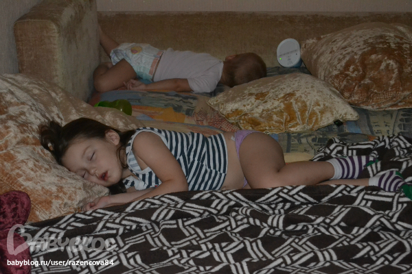 Папа повез бабушку и в21.40 мы пошли спать. Засыпают на нашем диване, потом Машу перекладываю в ее диван, ставлю радионяню, она мой спаситель и в 22.00 мои котятки спят.