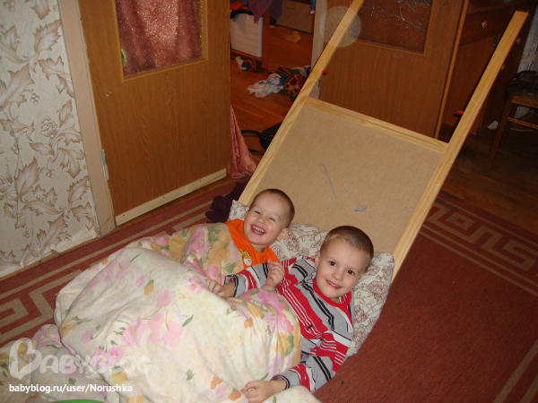 Игры погодковПока я сижу в интернете, мальчики мои играют неподалеку. Вот что можно придумать из икеевского мольберта! Полностью сами реализовали. Андрей лежал и пел: "Баю- баюшки-баю, не ложися на краю...". А через 5 минут эта конструкция стала машиной. Сейчас расшалились и получили указание все убирать, сложили мольберт и тащат на место, за шкаф. Горжусь своими хомячками)))