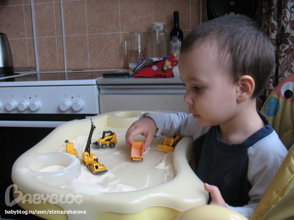 Купили эти машинки в ашане набор из 6 машинок 250р. Играть с ними просто так не интересно. Вот я и насыпала Мише манку вместо песка. Играл весь день так что зауши не оттащить.