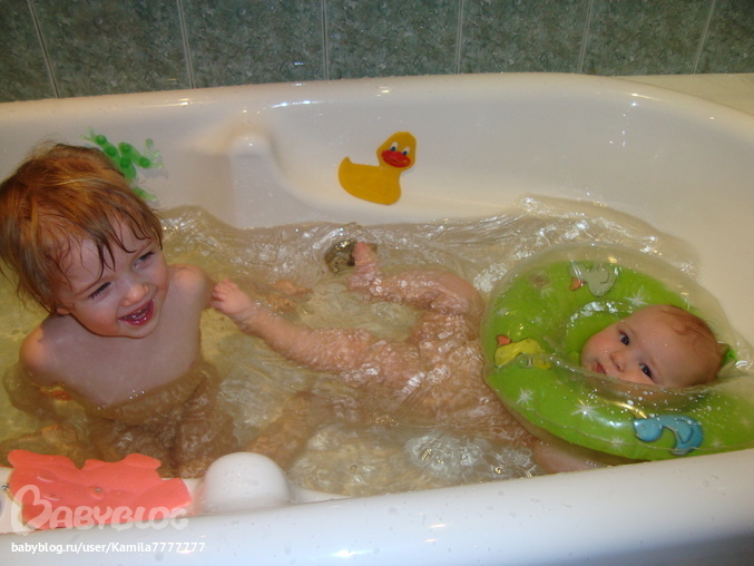 какие милые?)) а мы второго в горке купали, в круге как-то не прижилось... и у нас старшая была младше, чем у вас, когда начали так купать, она вечно брата за ноги тащила... пришлось снова отдельно запускать в воду)))