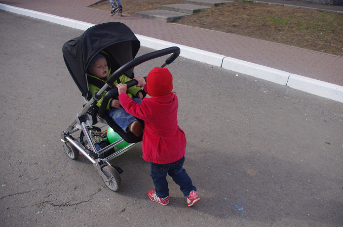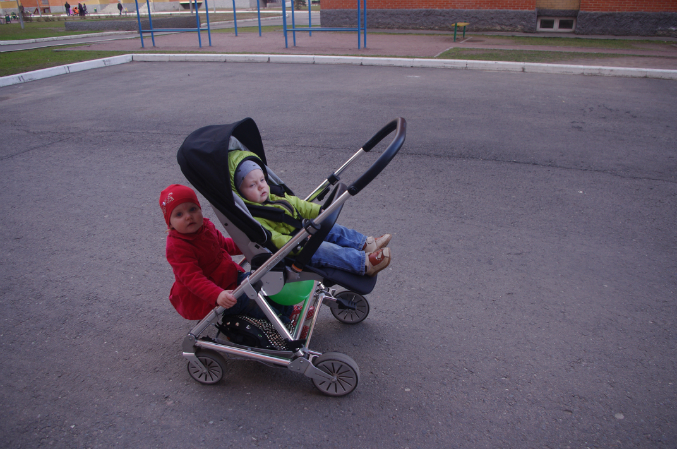 Класс, мы так иногда БД катаем. А если сиденье от мамы отвернуть, то можно малую ставить на перекладину между колес- ручками за бампер- и поехали :)