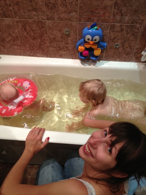 Но вот настал тот день, когда Лера выросла из мартасика и мы ей купили круг, в этот же день я решила попробовать их искукпать вместе... Стала подготавливать Викторию, что купаться будет с сестрой и надо быть аккуратной. Какая же радость была у Вики, когда я об этом сказала!!! Пока папа наливал нам ванну, Вика бегала вокруг нас, пытаясь забрать от груди Леру и тянула меня за руку, что бы мы быстрее шли купаться))))