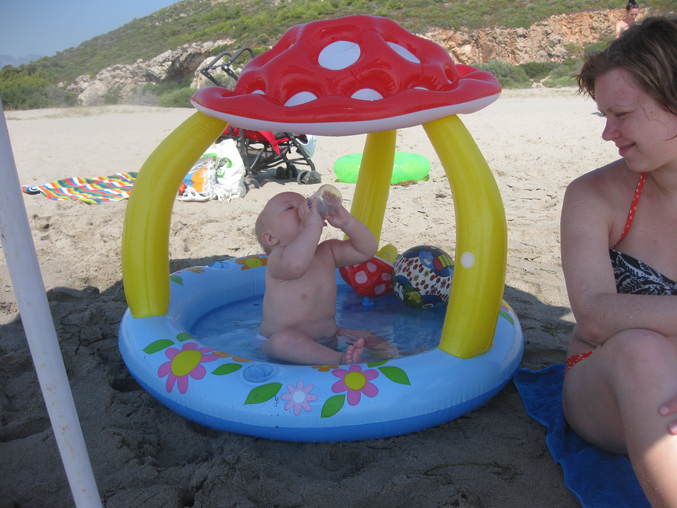 солнце.. я не парилась одеждой на Никушу, он парень жаркий, бегал голышом и босиком, я только периодически ловила его обмазывала его кремом 50+ (и папу заодно, который собственно за ребенком и бегал).