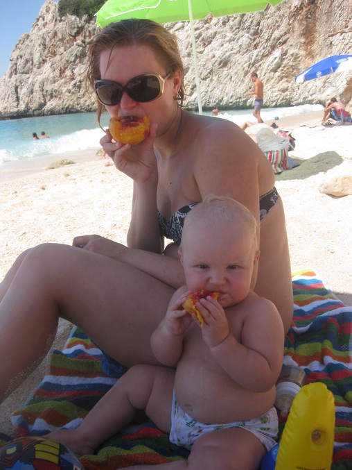 Еда.. тут я тоже не парилась, ибо жарко... не хочешь не ешь, съешь персик. По сути Никуша питался фруктами да кашей с утра. Пил тогда еще смесь и морсы всякие я делала, так как воду чистую он у нас пьет только из ванны)))))