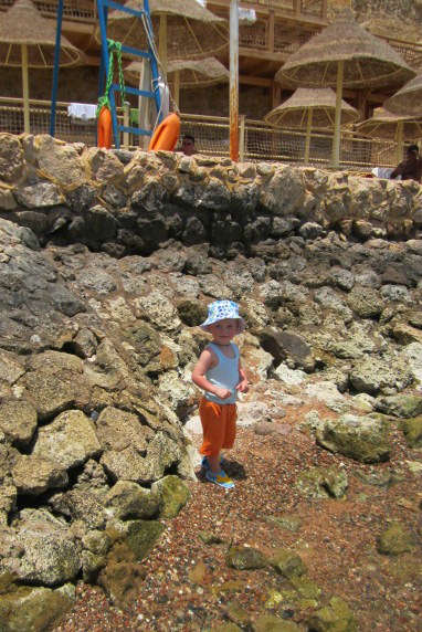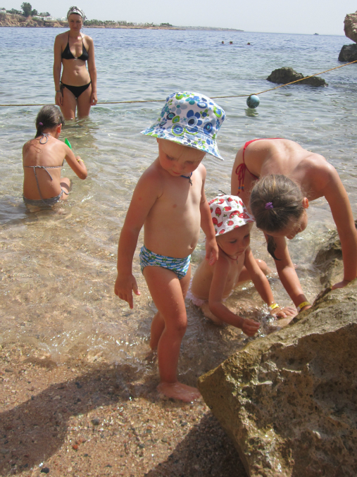 Дети первые дни плескались в бассейне, на море мы ходили только посмотреть, как -то мои сразу море испугались и Ванька даже не дотрагивался до него, Машка заходила в воду поколено, рассматривала рыб... еще мы один раз кормили рыб булками, так рыбы прям выпрыгивали на нас... хотя там везде и написано, что рыб кормить запрещено, но я эту надпись увидела только на 4ый день нашего пребывания...И после кормежки еще два дня подряд когда Машка захоила в воду (в основном она кормила) то тут же приплывали рыбы к берегу и с интересом высовывали сои мордочки из воды... Море там потрясающее, чистое, очень соленое (если сравнивать с черным), столько разной живности, мы видели ската, крабов, морских ежей, а рыб прто всех не переислишь...Пляж песочный, вход в воду только по понтону, мы нашли два места с маленькими заливчиками, где был песок и дети могли там немного поиграть и построить замки, а так - это отвесная скала, уходящая в море, Я не написала, что это Шарм Эль Шейх....Что бы подойти к воде надо преодолеть огромное количество ступенек, дети иногда отказывались идти и я носила их на рукх, что способствовало моему похудению на 2 кг (постепенно приближаюсь к идельному весу)... Мне было очень обидно, чт я не могу искупаться, т.к. детей там на берегу без присмотра не оставить, очень опасно...Но в последний день дети наградили меня за терпение и Машка вместе со мной залезла "в глубину", а Ванька спокойно посидел в кресле на понтоне, и мне удалось, хоть немного, насладиться плаванием в красном море...