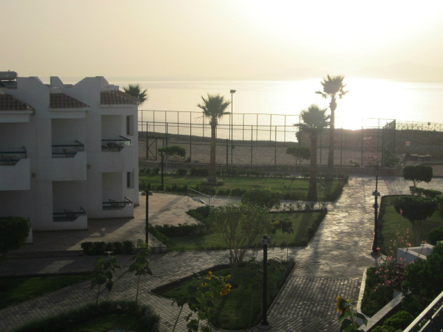 В 5 утра дети меня разбудили...Уговариваю поспать еще, но бесполезно, в Москве-то уже 7 - а это наше время подъема...встаю, умываемся, одеваемся, идем гулять, т.к. до завтрака еще 2 часа...Как оказалось нас поселили очень хорошо, нам что до моря, что до ресторана, что до пляжа, что до детского клуба идти 7 минут... Номер был "без особого вида", но нам были видны и горы и море, и не светило солнце в окно, а от номера с видом на море были залиты солнечным светом с восхода до 12 часов..