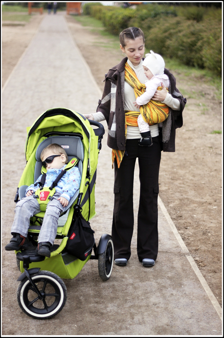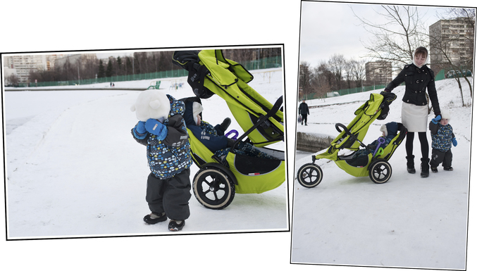 Поначалу Фил был и для меня в диковинку, конечно. После сомнительного удовольствия прогулки с двумя колясками (я рассказывала об этом приключении здесь - http://www.babyblog.ru/community/post/pogodki/1712643), я относилась к моему яблочному чуду с огромным трепетом. Мыла после каждой прогулки колёса:)) Ещё бы: я ж теперь могла гулять одна с детками! И мы помещались в лифт, и мы проходили в узкое пространство на кассе супермаркета. Дополнительное сиденье крепилось легко и быстро (реально, пара секунд) и оказалось весьма вместительным, даже старший ребёнок легко помещался в пухлом зимнем обмундировании. К тому же ему там очень нравилось ездить: "Высоко сижу - далеко гляжу!", в то время как грудничку внизу явно было удобно, мягко и очень уютно, плюс люлька хорошо защищена от ветра боковыми стенками, которые, как перепонки, расправляются при раскладывании кресла, защищая ребёночка от ветра справа и слева.