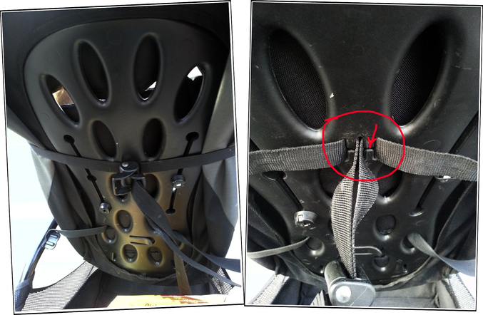 ЭКСПЛОРЕР: два ремешка обнимают сзади спинку и по центру плотно соприкасаются, сходятся в "пучок", который фиксируется зажимом. И вот у тебя уже неограниченное количество уровней наклона спинки, её можно установить под любым желаемым углом! Длину строп регулируешь реально одной рукой. Ну ладно, двумя. Одной придерживаешь спинку, чтобы не было резкого падения, другой выпускаешь или укорачиваешь эти стропы, двигая фиксатор. Но были и погрешности у этой, казалось бы, безупречной системы: несколько раз случалось у меня такая хворь, что при поспешном неаккуратном регулировании один из ремешков из этой щели в спинке кресла выскакивал. На фото показала красным маркером.
