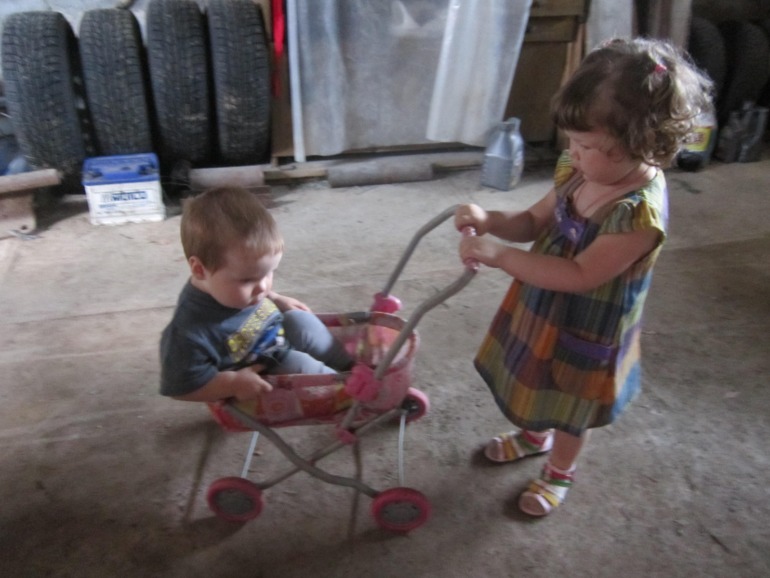 Я если честно понятия не имею чья эта мысль у них была,чтоб так кататься. Они с нянькой гуляли, я в огороде была, потом нянька кричит - иди сюда,смотри что вытворяют, захожу в ограду, там мелкий карабкается в коляску, залез такой и командует старшей - вези,мол..