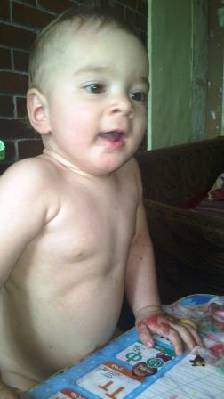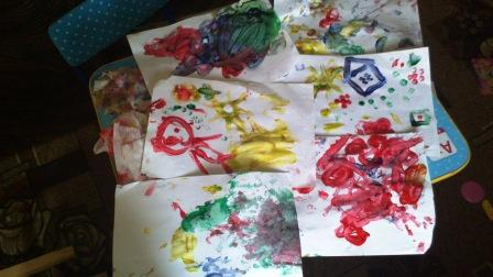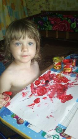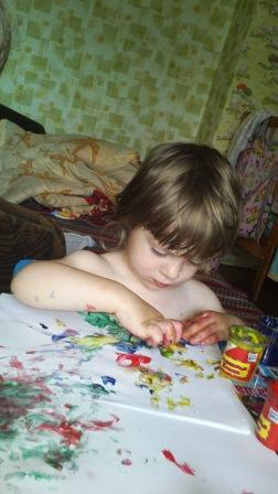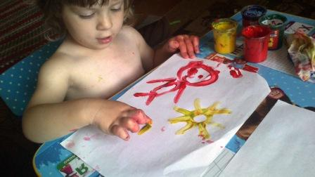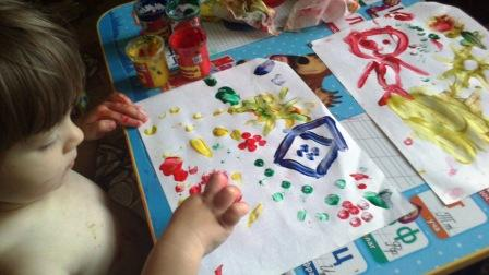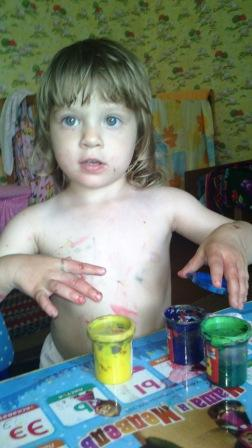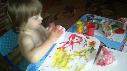 Игры погодковПока наша младшая сестренка Ариша спит, мы с Настюшей решили "каси пачи"или "пачки", т.е.рисовать пальчиковыми красками.