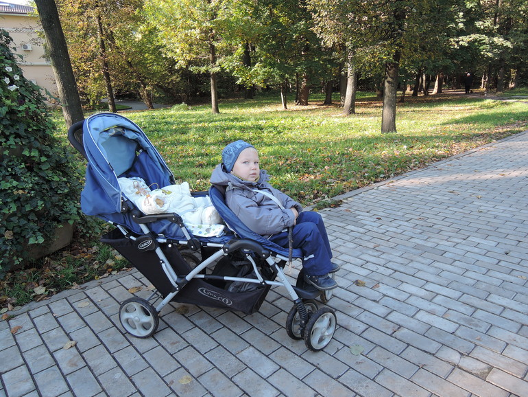 Очень удобно!!! но! старший устает и начинает усаживаться на подножку, а пока он не уставший он то и дело соскакивает с подножки. Но это у меня такой непоседа, знакомая во дворе со старшей девочкой такого же возраста не мучается, потому что у менее дочка встанет и стоит спокойно всю дорогу. Еще про коляску: мы ее брали в Тверь (где нет дорог и тротуаров вообще!!!!), на дачу, к друзьям за город по песку - я проезжала везде. 3. Оба пацана на коляске для погодков Graco Stadium Duo (у нас она малось поюзаная - нет переднего капюшона и бампера). Прикольная она, маневренная, но у нее колеса передают все неровности и зимой мы еще не ездили, но боюсь что на проедет только по чищенным протуарам :(