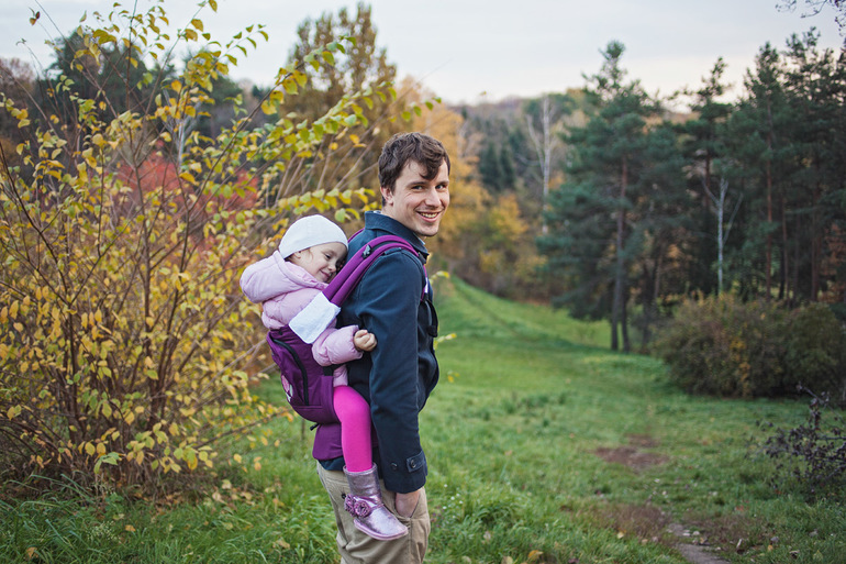 вот тут на фото уже взрослую девочку за спиной папа держит