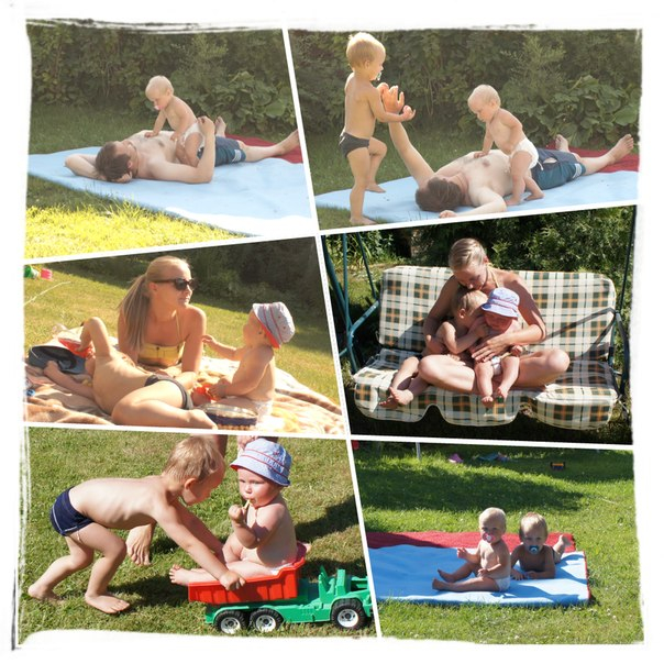 мои мелкие носились на природе, типа купались в Ладоге (колени мочили, а дальше для них казалось слабо)), Яся увлечённо ела песок, я мужественно запрещала, на что слышала от неё трехэтажный плач, Елисей разрисовывал красками кусты, прыгал в траву со стола, оба, скрепя сердце, балдели в парилке. Короче, нам было хорошо