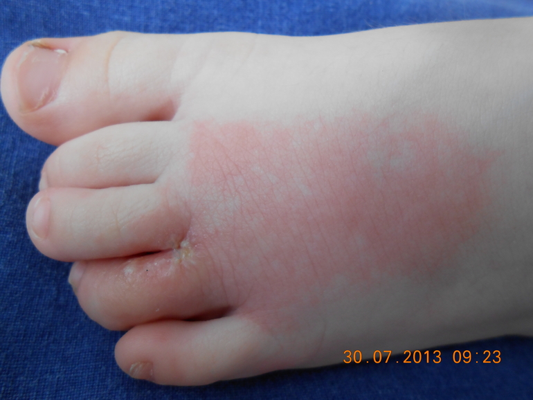 не гноится, там кожа облазит между пальчиками, и как будто мокнет, ребенок на боль не жалуется