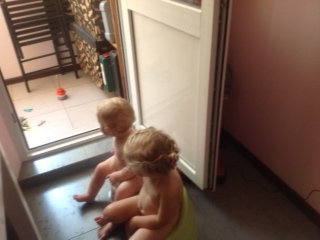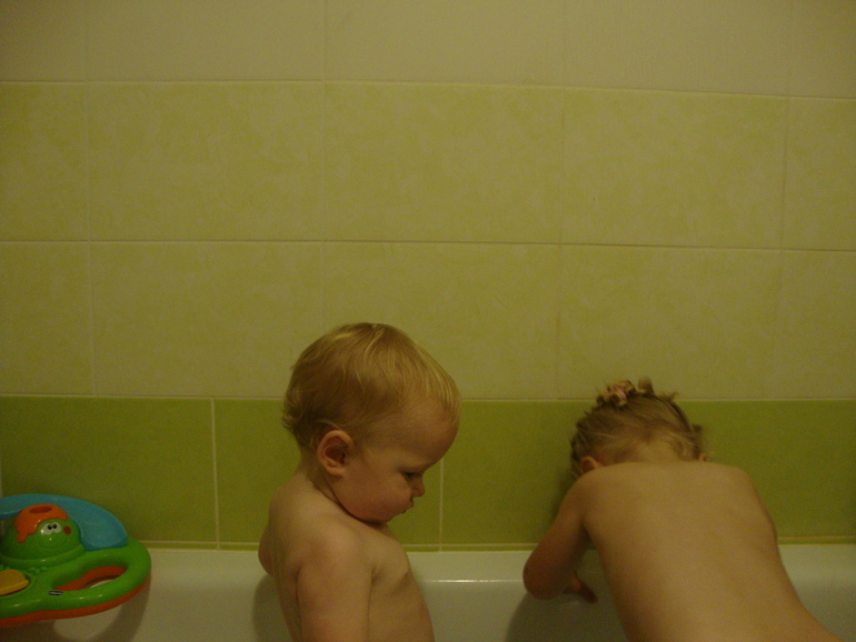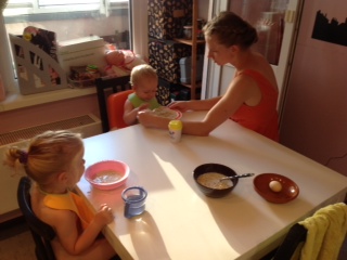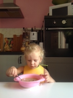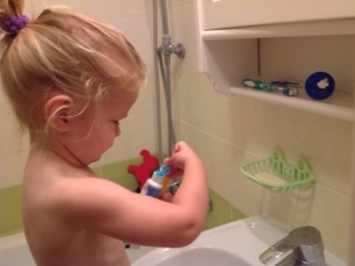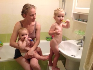 Затем я иду готовить завтрак и умываться. Затем умываю детей, одна чистит зубы, другая наблюдает и ждет очереди.
