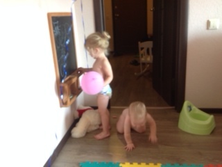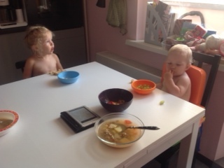 Проводили папу (сфоткать этот эмоциональный процесс не удалось), дети развлекаются, я собираюсь на прогулку: пишу список продуктов,наливаю компот, воду и пр. короткие действия, которые из-за их многочисленности занимают кучу времени. Дети играют.