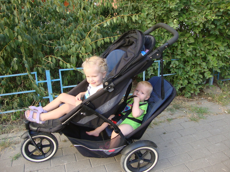 Так мы ездим на дальние расстояния, вроде рынка. Вообще за верхнее кресло ведется бой, но когда много продуктов нужно купить Жека довольна, а Маня молча усаживается вниз. Вообще, коляска отличная в маленький лифт влазит, по пандусу съезжает, место в корзине много. Только вот весит все это вместе с продуктами под 50кг:( катить ничего, а вверх по пандусу и через пороги, жесть!