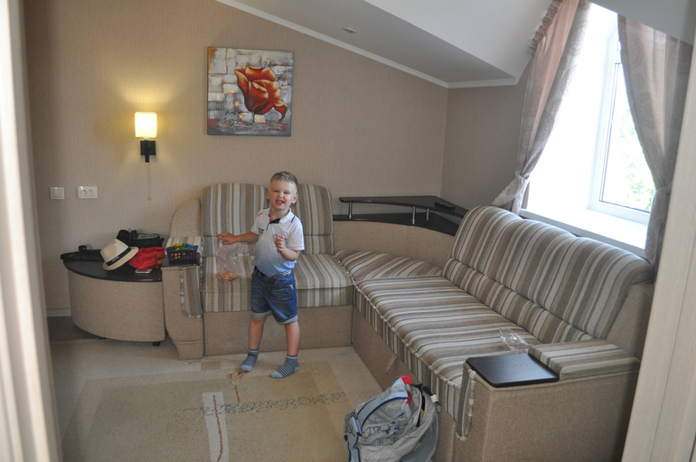 Свою поездку мы целиком и полностью и продумывали и организовывали сами-сами нашли жилье в интернете, оплатили курсовку в санатории и прошли необходимые детям процедуры. Поскольку цена проживания в пансионатах и санаториях значительно выше чем в частном секторе, то выбор пал на него-так мы нашли нашу трехкомнатную мансарду с новым ремонтом в двух минутах от моря по цене..мм.. в два раза дешевле чем семейный номер в пансионате: