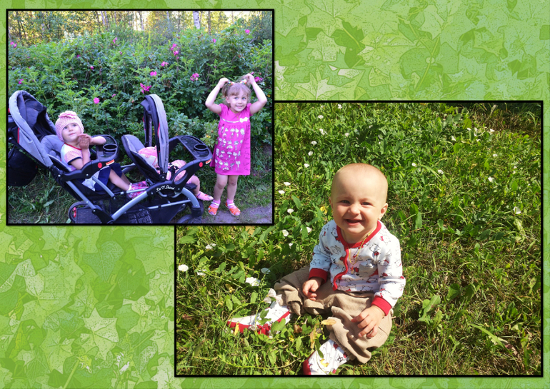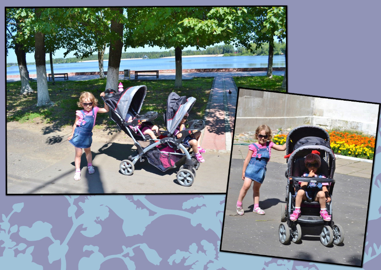 Когда сидели вместе в коляске, обычно напевали какие-нибудь песни. Про Антошку, Про ёлочку, про волшебников, про звёздочку, чунга-чанга или "мне мало,мало тебя" или "и дочку, и точка". Забавно было смотреть на прохожих
