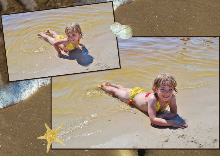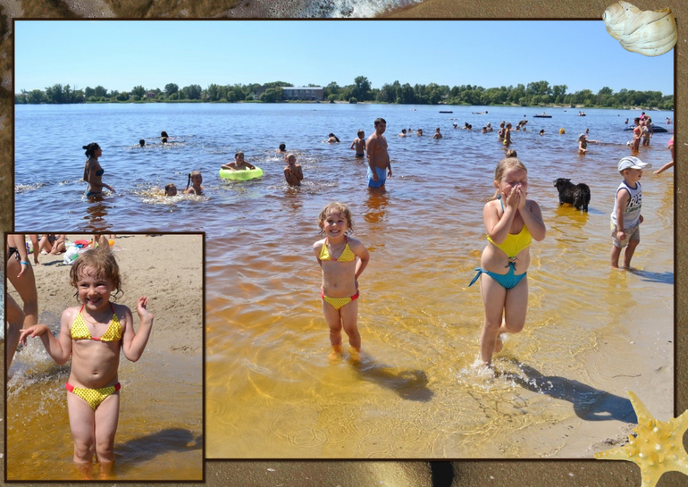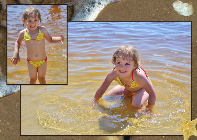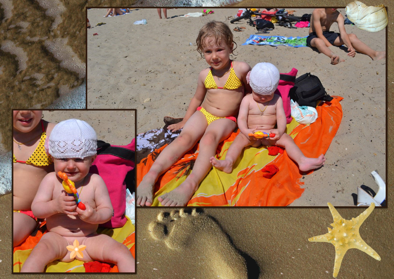 А это мы на пляже. Алиса в это время в коляске сидела, не хотела она на пляж идти, выкобенивалась. Ну и флаг тебе в руки, барабан на шею! А мы позагорали и поплавали :-)