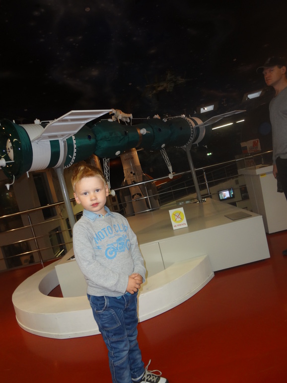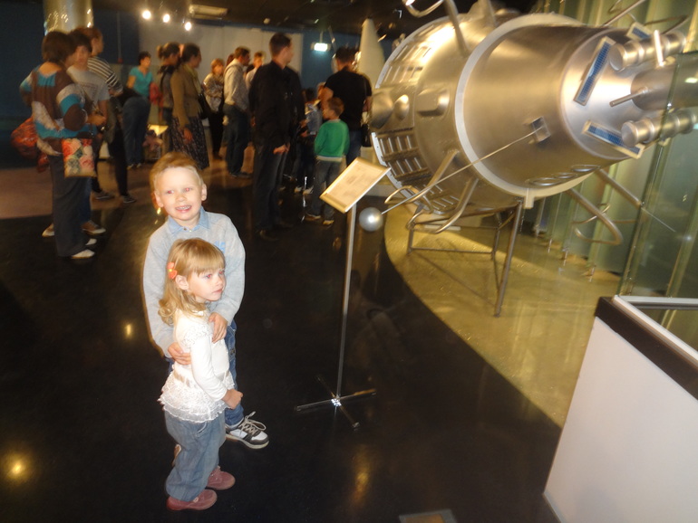 Когда у меня не было детей, я и не подозревала, что в 2 и 4 года они с интересом могут слушать речь экскурсовода и никуда при этом не разбегаться=)Испуга(и что удивительно особых расспросов) не вызвали и столь пугающие не в меру впечатлительных родителей чучела Белки и Стрелки. Зато особый интерес и не желание уходить конечно вызвали ракеты и космические корабли: