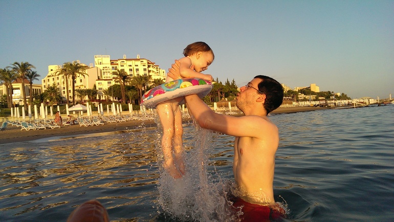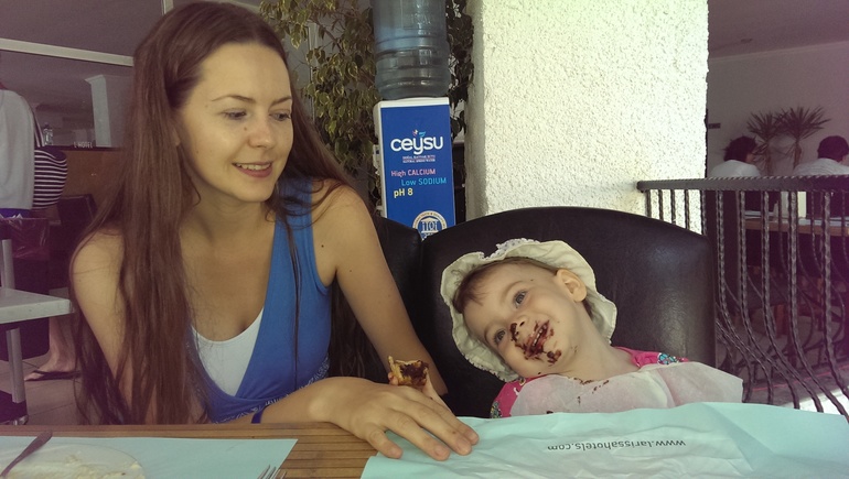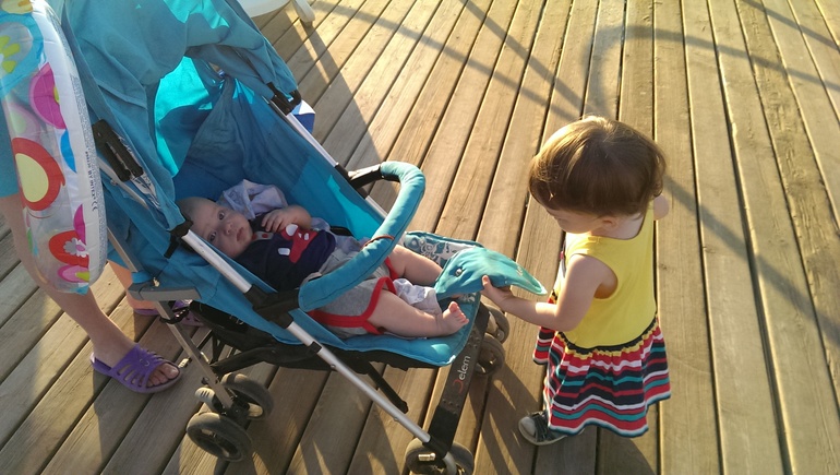 Первые пару дней было тяжеловато, Кристина везде носилась как бешеная, мы уставали тоже. Главное, было приспособиться: поесть было вместе невозможно, поэтому приноровились в обед есть по очереди, пока дети укладывались, а вечером давали (педантичным родителям не читать) ей айпад, пока сами кушали. Зато эстафету вечером брал Данилка. Ему резко надоедала его коляска, и он требовал внимания. Надо сказать, что и без плача к нему постоянно все лезли, а если уж он капризничал, то весь персонал ресторана кидался его утешать, щипать за щеки и руки. Один раз вообще стали его вытаскивать из коляски, видимо хотели покачать на руках!! Кристина закричала: «Мой маленький»! Меня это порадовало, так как она в основном дома его ревновала, и говорила «уйди, маленький».