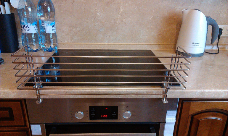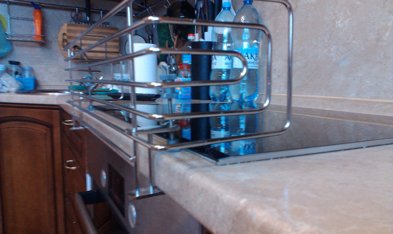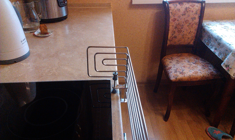 А не так давно младший решил стащить сковороду с плиты, хорошо хоть просто теплая была. И появилось вот это. В Москве продают только "экраны", которые крепятся на скотч. Ну или нашла одну фирму со штукой как у меня, предложили купить новую кухню, а эту штуку они подарят. Просто так не продают. Но вещь супер!! Заказывала из германии, по ошибке заказала 2, так что одну могу продать.