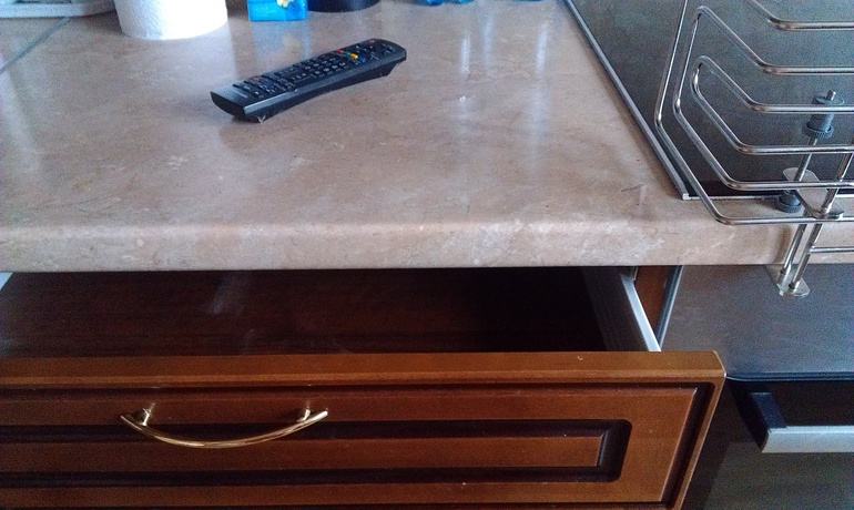 На кухне есть ящик где раньше лежали ножи, вилки, ложки и прочие столовые приборы. Столешница на 1,5 см выпирает и никак я не могу найти что-то что запирало бы этот ящик. Вилки и ложки живут в шкафу, это неудобно(((. Может что посоветуете?