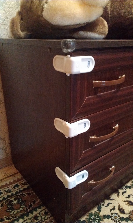 Ну и ящики - это, наверное, классика. Думаю есть у всех. Двухлетнее испытание на прочность прошли только такие замочки, все остальное детьми или отрывалось с корнем, или очень быстро открывалось. (И силиконовый уголок на острый угол тумбы).