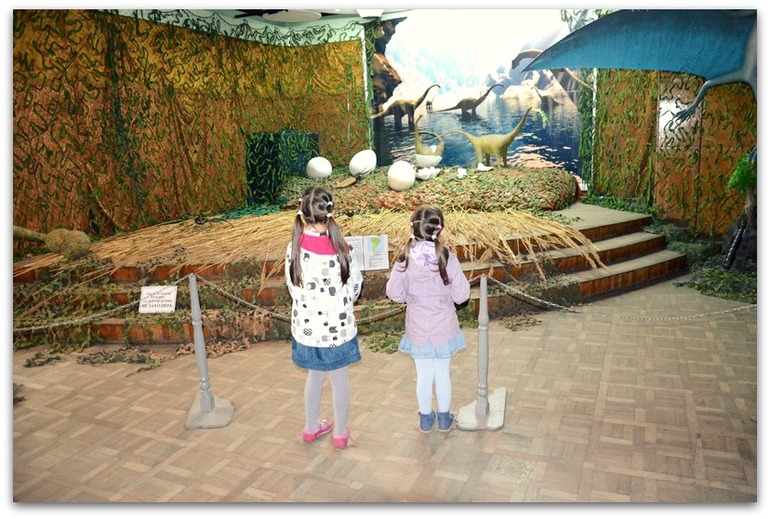 Почитали имена древних животных, снова попытались их запомнить, отметили прекрасные белые яйца травоядных, поиграли с теранозавром в игру «Мама и дети».