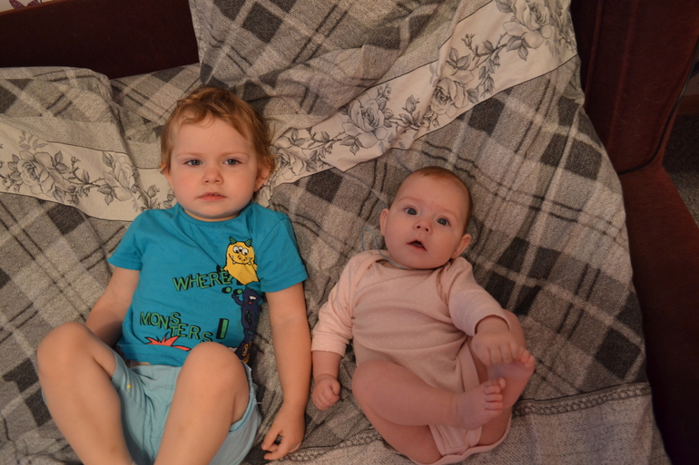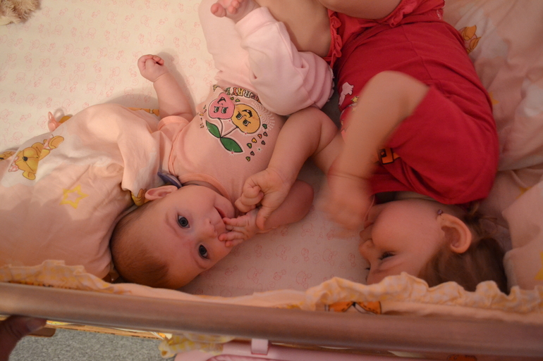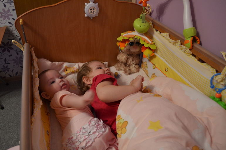 Сейчас Ира подросла и начинает проявлять активный интерес к сестре. Они любят вместе валяться в кроватке. и повторять друг за дружкой