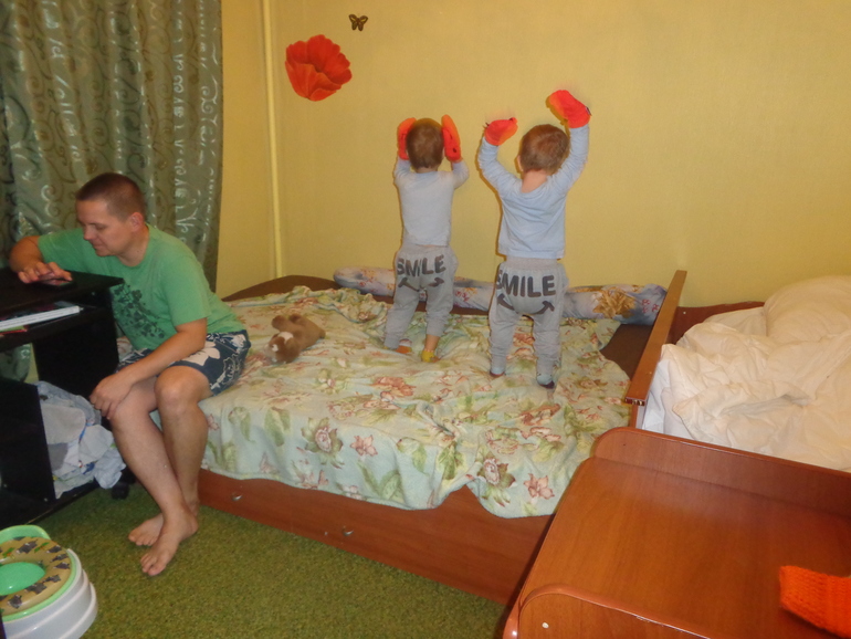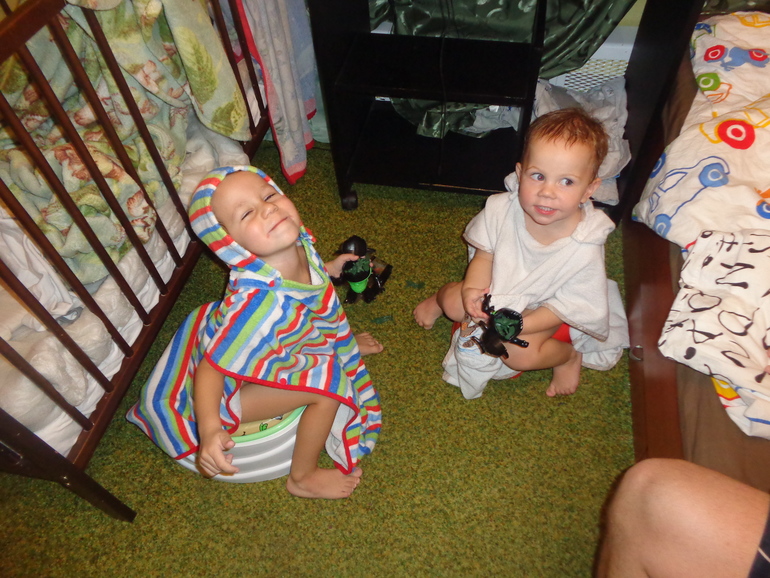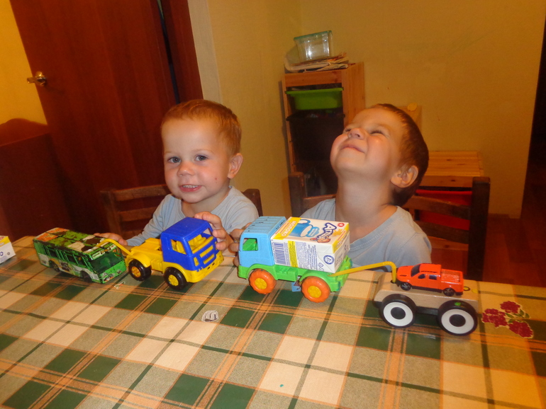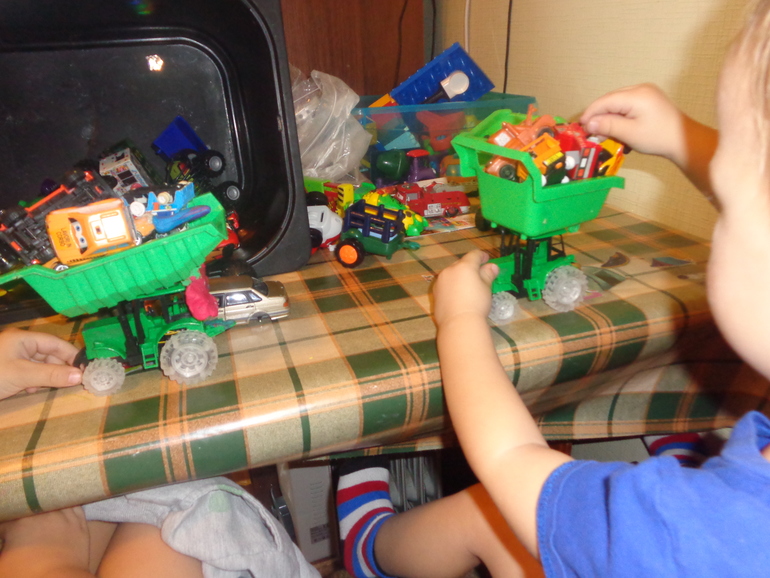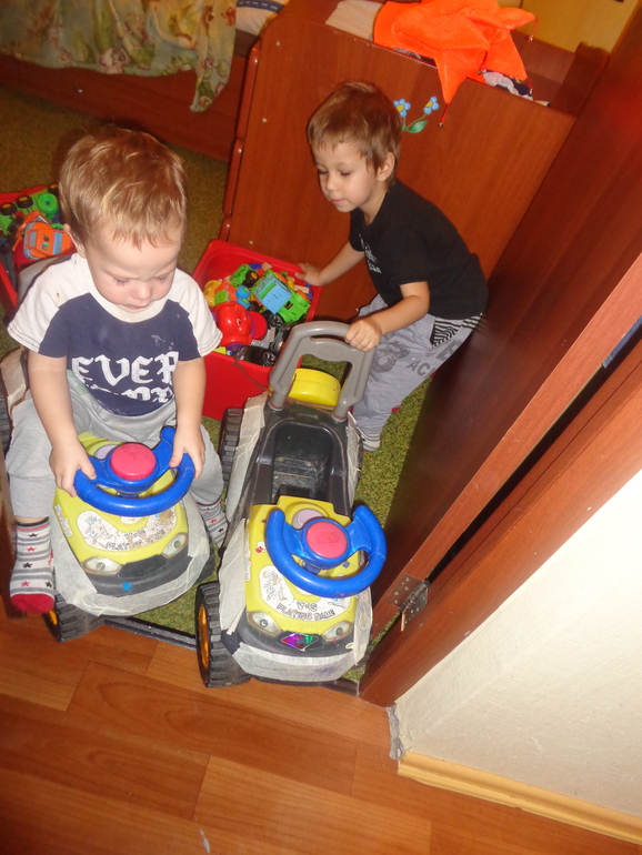 Игры погодковНужно всё одинаковое - это не шутка. )) Вот такой ерундой мы страдали сегодня. К убитым каталкам, обклеенным "как у братика" строительным скотчем, были примотаны на шнурки икеевские большие контейнеры доверху набитые игрушками)) И эта конструкция ездила по квартире =))))