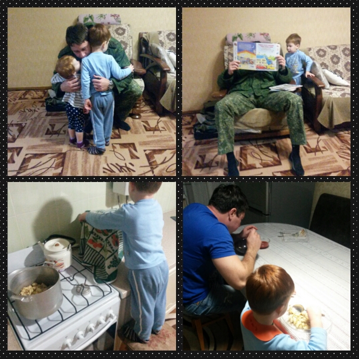 18:58 Приходит папа с работы. Кстати, папа очень часто приходит на обед. Сегодня, Бог миловал, а то пришлось бы еще что-то готовить из еды. Дети рады папе, жалуются на меня, что я их ругаю, папа их жалеет. Папа так сильно устал на работе, что даже не может встать с кресла. Дети не растерялись и быстро ему книжки принесли. Минут пять сидели рассматривали. Далее всем руки мыть и за стол.